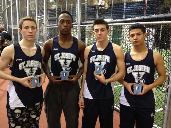 CHSAA Intersectionals - Armory After a rough morning for most of the team; we rebound a run some really nice 300's. As a matter of fact, 19 out of 25 runners in the 300 set a PR led by a big race by Chris Bertosen, 37.99 FAT. In the 300 meters, 7 guys breaks 40 seconds. The Varsity 4x200 knocks down their seasonal best in 1:36.24 FAT. The "B" team also recorded a personal best of 1:38.53 FAT. The frosh 4x200 relay crushes a personal best by clocking a 1:47.08 on a big anchor leg by Jeremy Cassamassino. To close the night out, in their last attempt at the Soph 4x800 record, Rob Ruspantini, Nick Velez, Robbie Guidicipietro & Mateo Velez slide under the old mark of 8:40.5. Nick Velez (2:00.9,) Guidicipietro (2:09.4) and Mateo Velez (2:16.9) all record personal bests. Note: Almost 3 months to the day, Mateo Velez was across the street from the Armory recuperating from heart surgery. It was his big anchor leg that ensured that the relay record was broken. This just shows you..."Never Give Up!" ![]() |