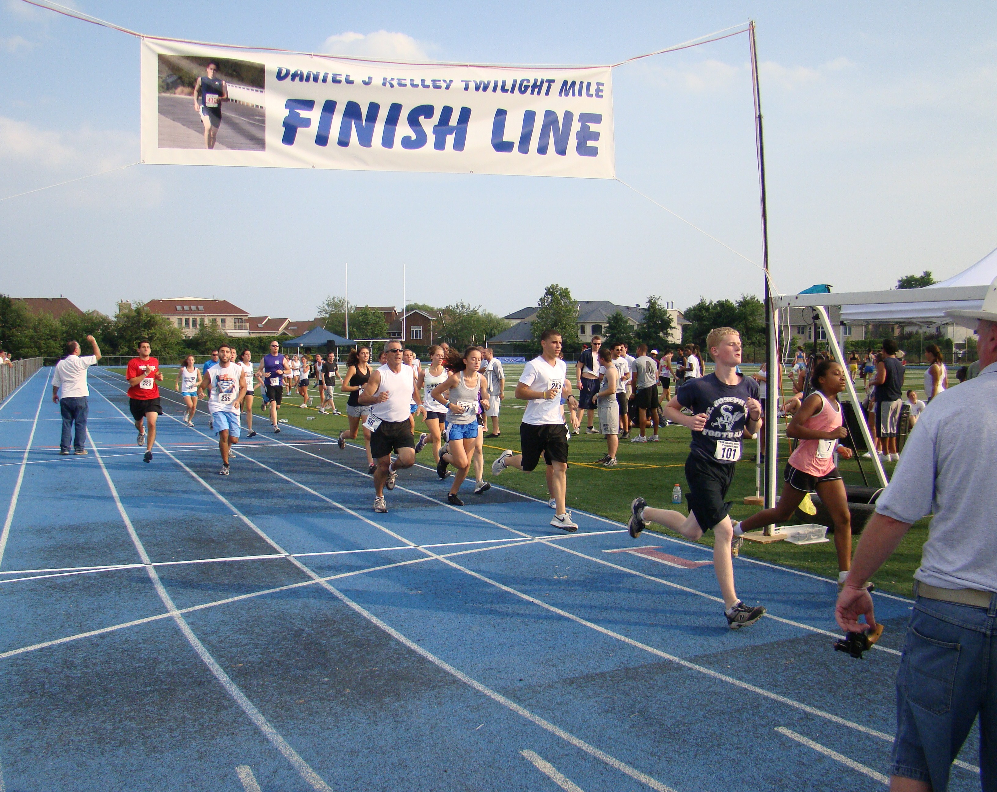 | Runners in one of the earlier heats make their way under the Finish Line banner. |